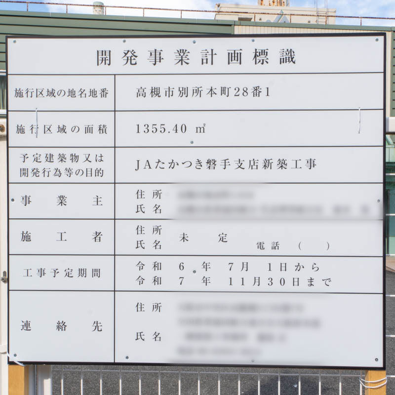 予定建築物の欄をみると、「JAたかつき 磐手支店」新築工事と記載が。