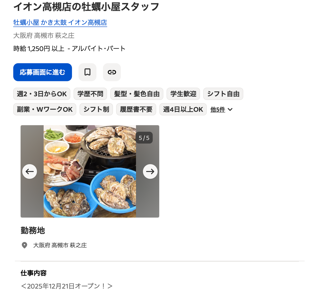 (イオン高槻)求人情報によると、イオン高槻の駐車場に「牡蠣小屋 かき太鼓 イオン高槻店」という牡蠣小屋が12月21日にオープン予定とのこと。