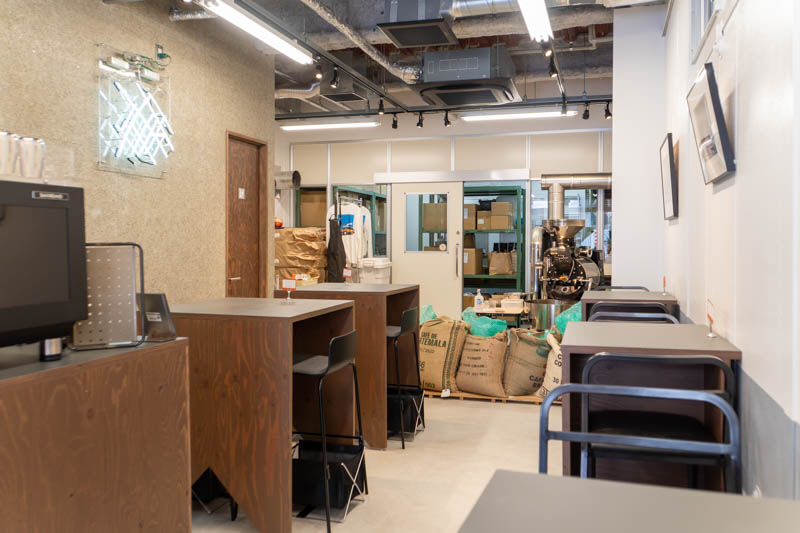 奥にはイートイン用のテーブル席と珈琲焙煎機があります。店内は豆のいい香りが。
