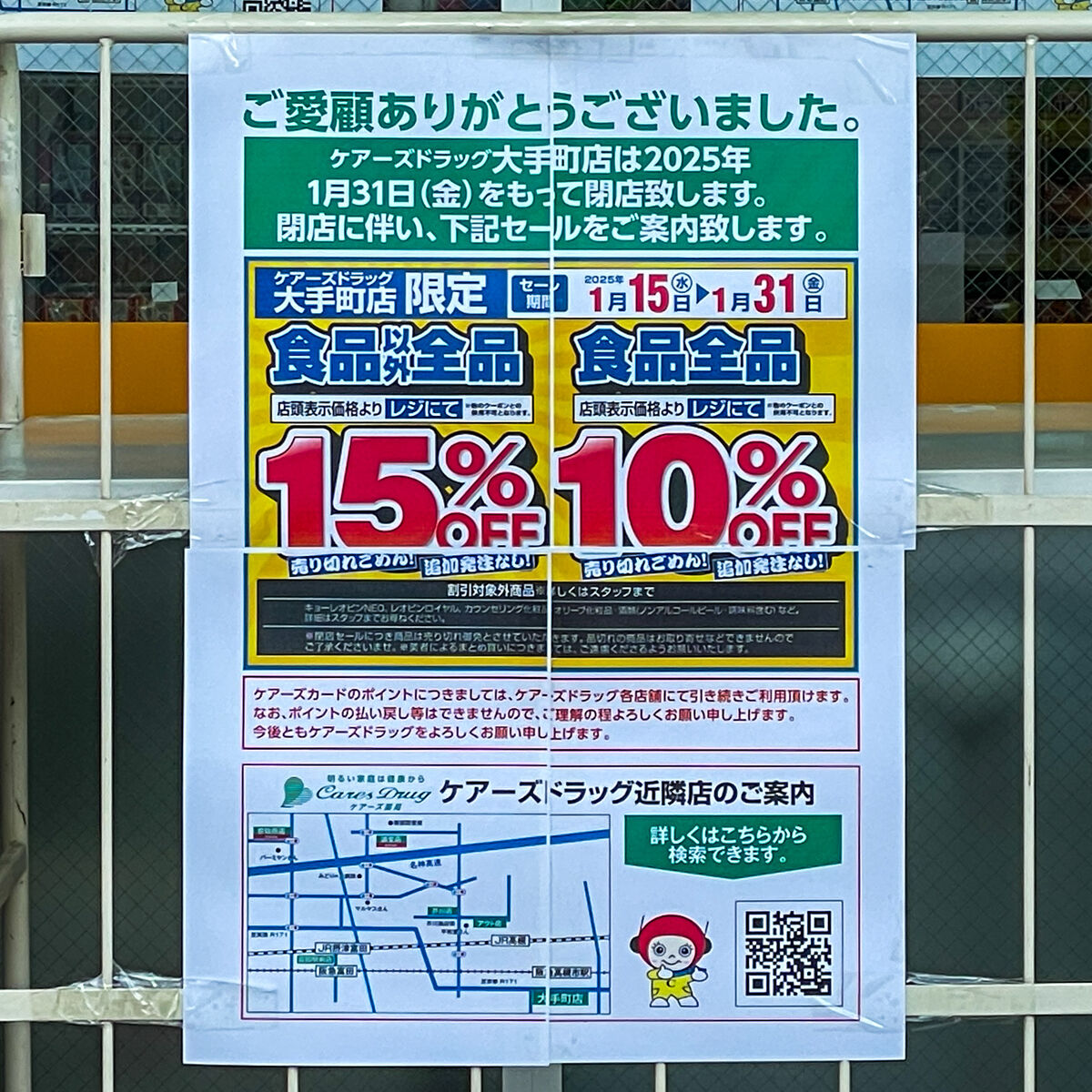 大手町の「ケアーズドラッグ 大手町店」が1月31日で閉店するようです。