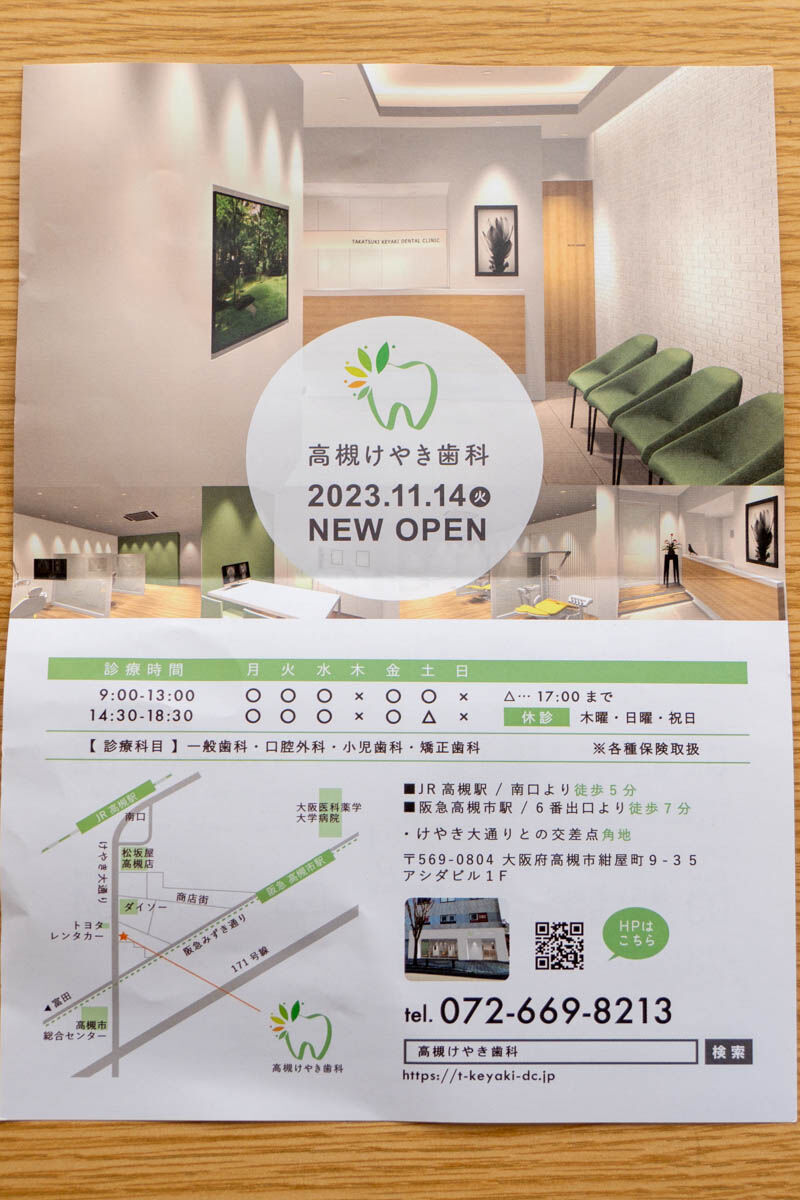 けやき大通りぞい紺屋町につくってた「高槻けやき歯科」がオープンしてる