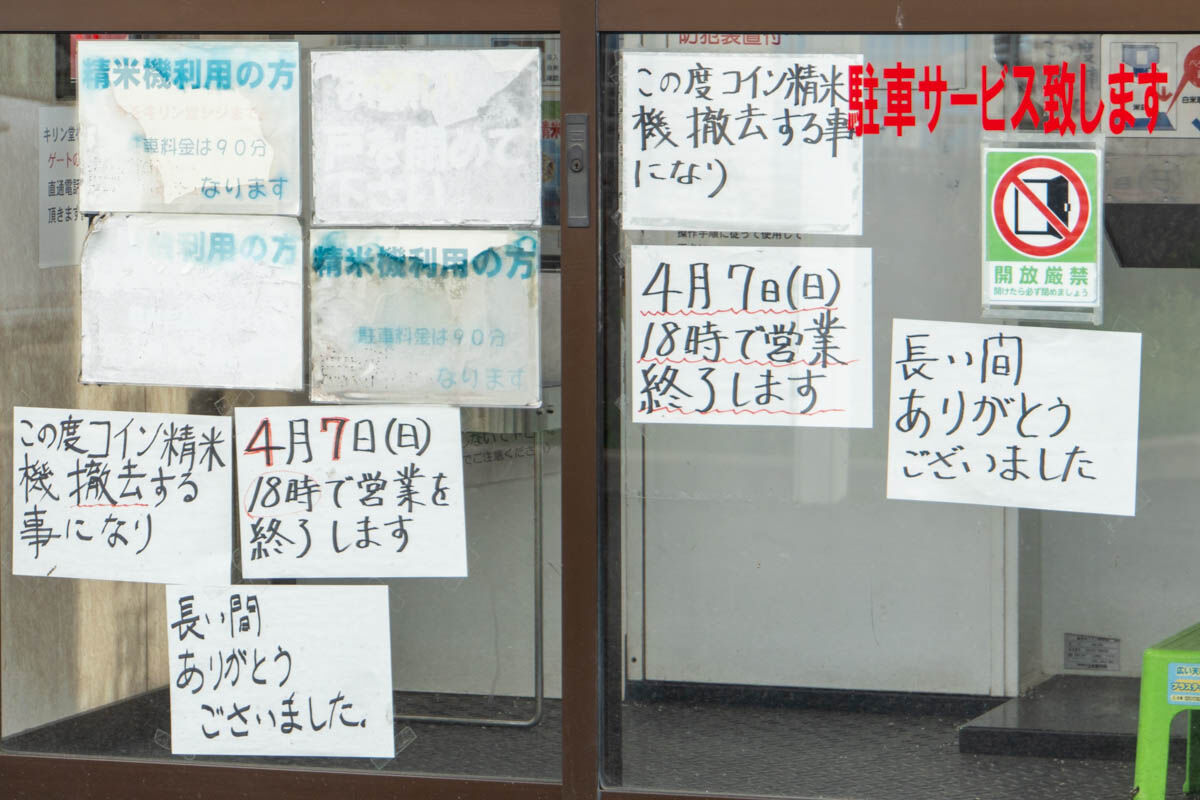 さらに、駐車場の端にあるコイン精米「匠の精米」も4月7日18時で営業を終了するそうです。