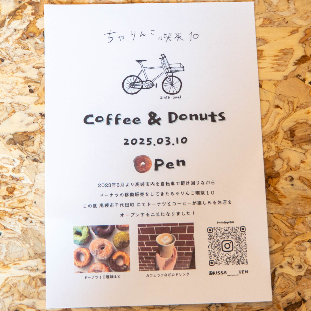 「ちゃりんこ喫茶10」は、2023年6月から始まった自転車でのドーナツの移動販売期間を経て、3月10日にコーヒーとドーナツが楽しめる実店舗をオープンされたとのこと。