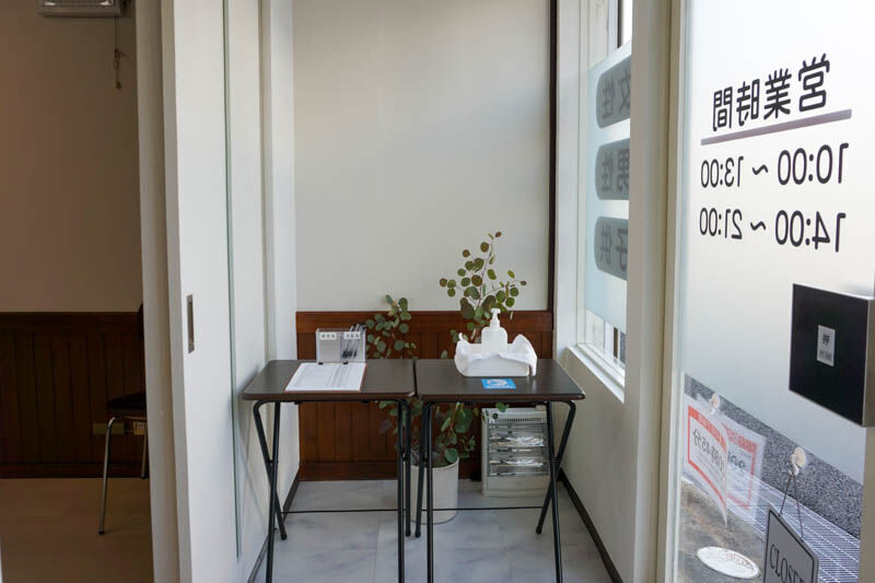 消毒スペースと同じ空間に待合いスペースがあって待っている間の天候の心配がなさそうで嬉しいですね。