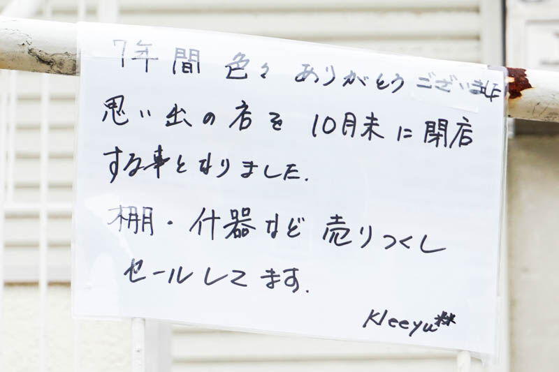 古曽部町の「kleeyu**(クレーユー)」が10月30日で閉店。店内什器を10月19日まで販売中