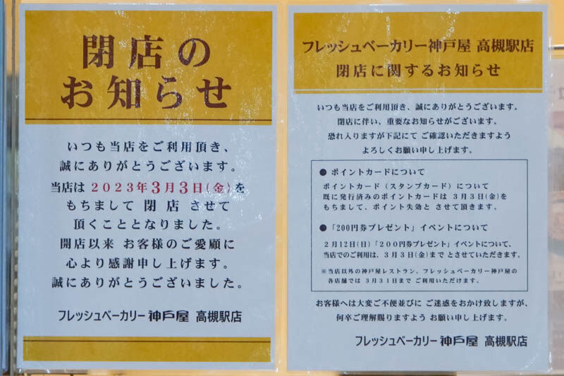 JR高槻駅の「フレッシュベーカリー神戸屋」が3月3日で閉店
