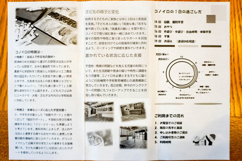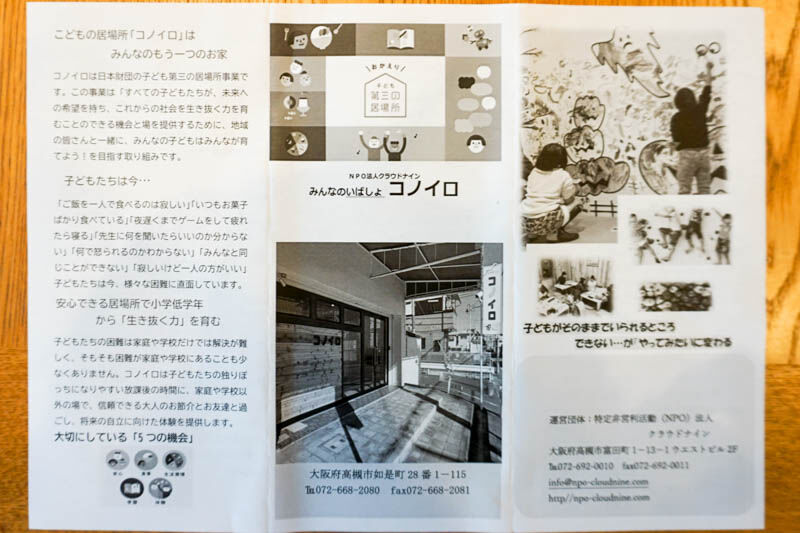 「コノイロ」とは、NPO法人クラウドナインと日本財団が支援している「子ども第三の居場所プロジェクト」が連携して立ち上げた、小学生の子どもたちを対象に様々な支援をする場所だそうで、大阪でも数少ない施設とのこと。
