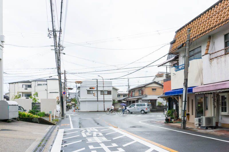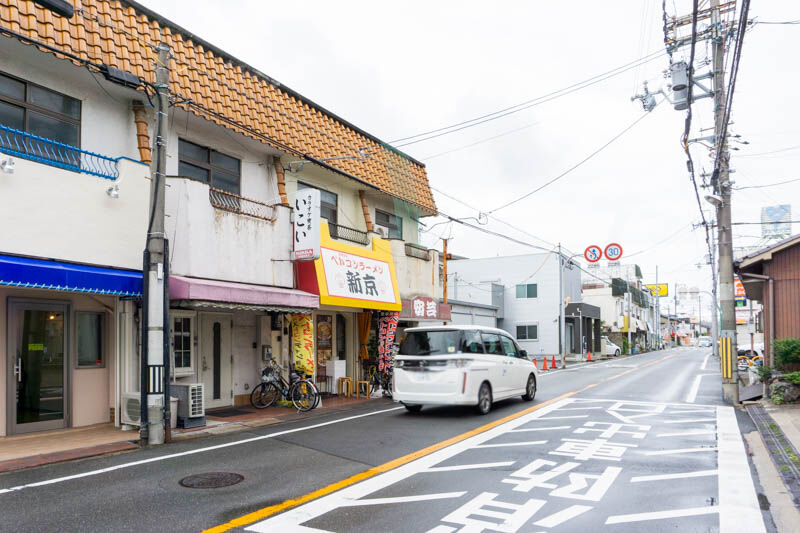 こっちに行くと同じ建物の並びにはラーメン店「新京」が、この道を進むとゲオや6月にオープンした「麺屋 山うち」などがあり、府道16号線に。