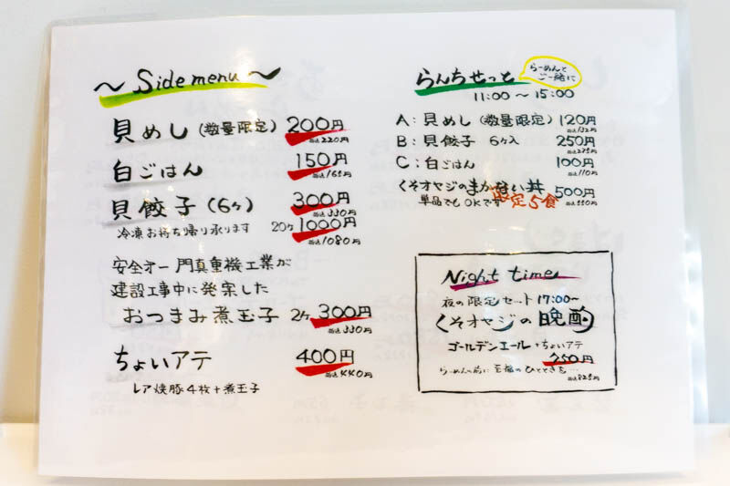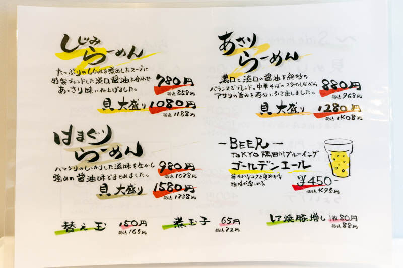 しじみラーメン780円、あさりラーメン880円、はまぐりラーメン980円。いずれも追加料金で貝大盛りが可能とのこと。
