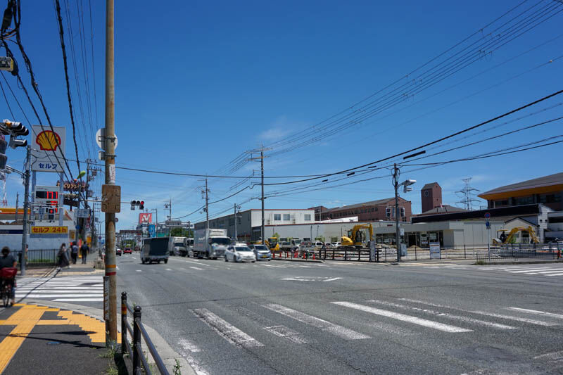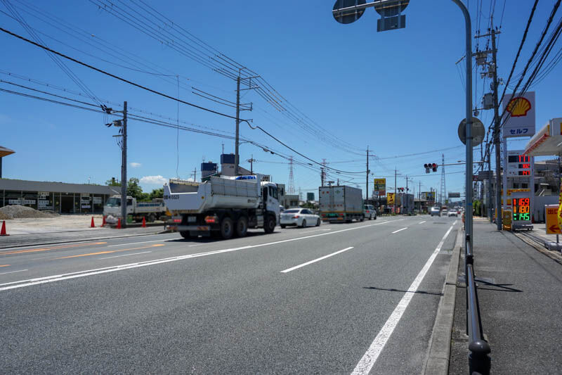 反対方向に行くと、目の前は昭和シェルのガソリンスタンドがあり、びっくりドンキーやGUを進んで家具店「マナベインテリアハーツ」などの方。