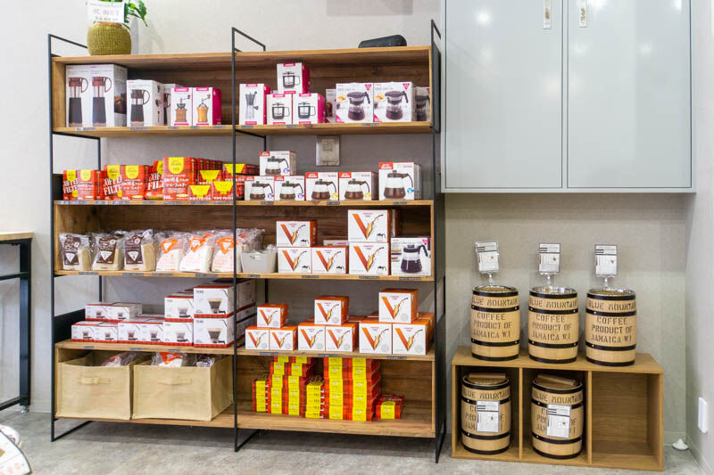 コーヒー豆の他、自宅でコーヒーを楽しめる用品や、
