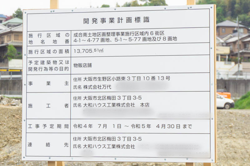 高槻市成合南土地区画整理組合によると、万代のスーパーを核とした複合店舗ができる予定とのこと。