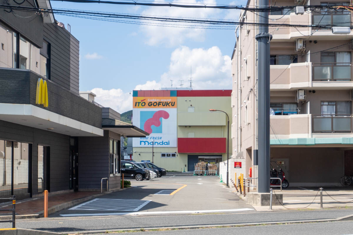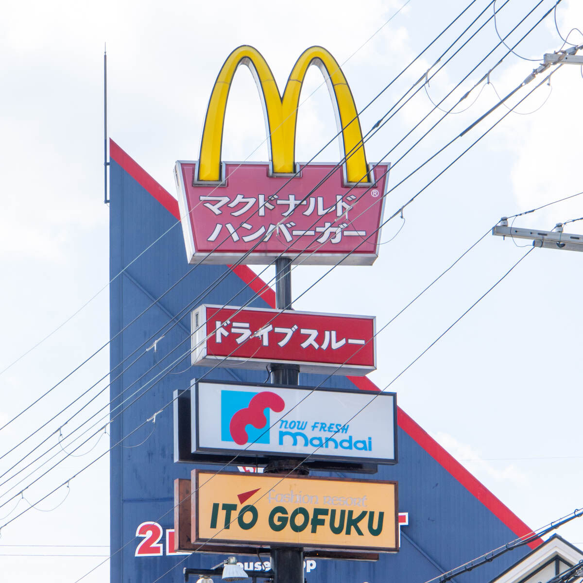 手前にマクドナルドがあり、奥に万代が入る建物があります。