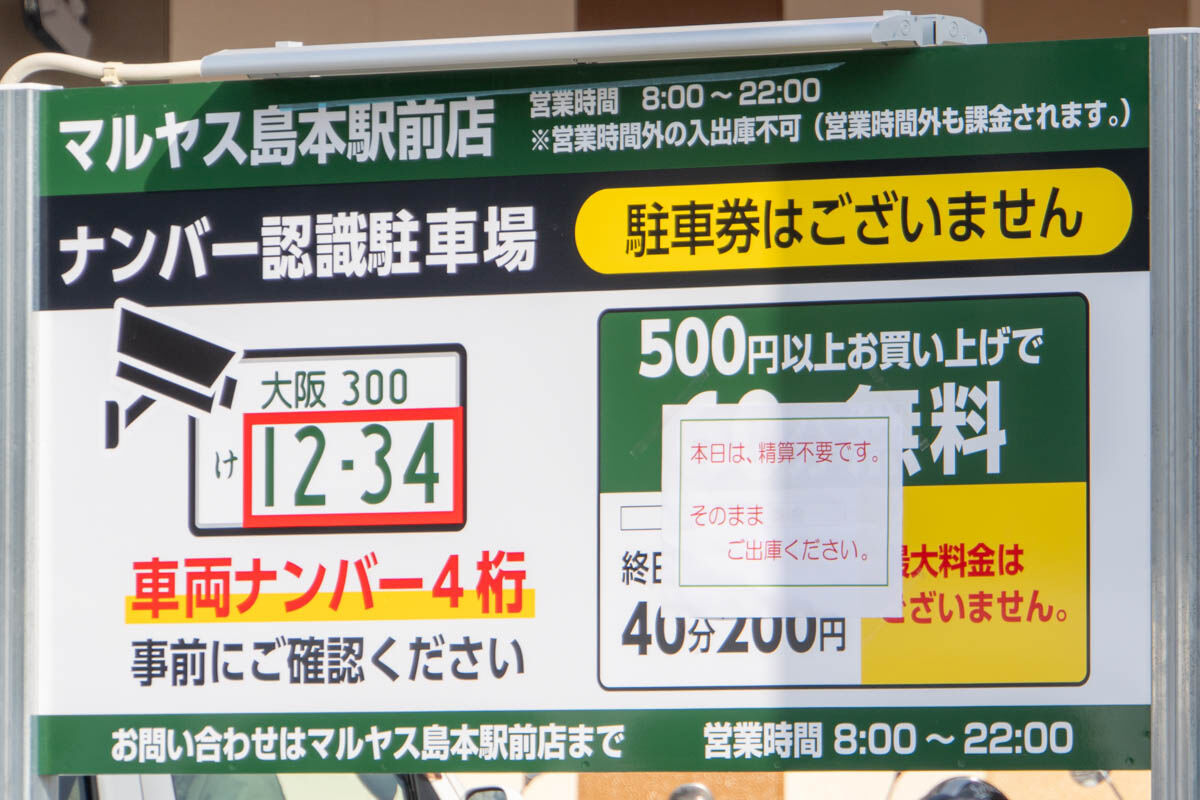 駐車場には56台が駐車可能で、ナンバー認識タイプ。マルヤスの営業時間外は出入庫不可なので要注意です。