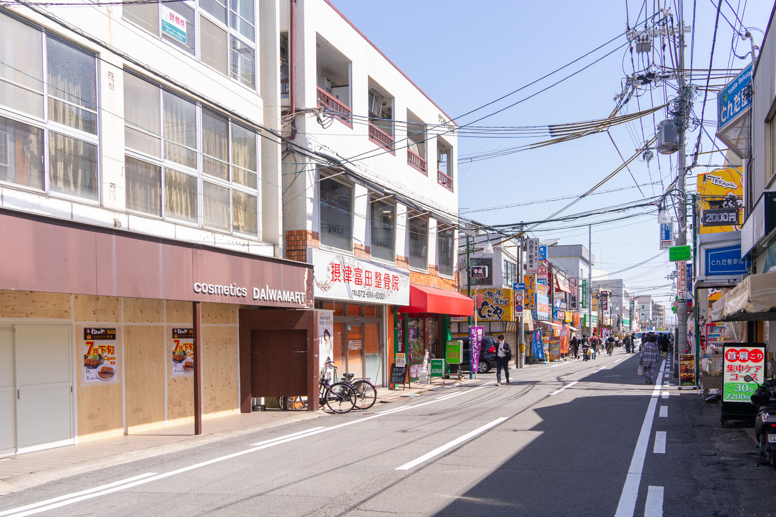 こっちに行くと、ファミリーマートやケアーズドラッグ、すぐ先には阪急の線路があって阪急富田駅に。