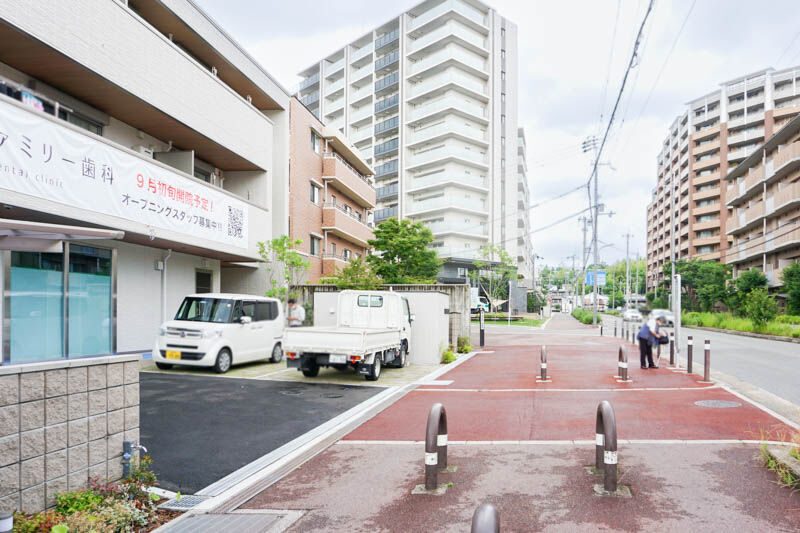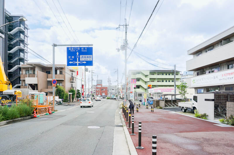 反対方向に行くと、ちらっと向かい側に見えているのは、建物ができてきた建設中の9階建てマンション「レ・ジェイド高槻別所」でして、サーティワンやブックオフなどがあり、八丁畷交差点の国道171号線や国道170号線の方面です。