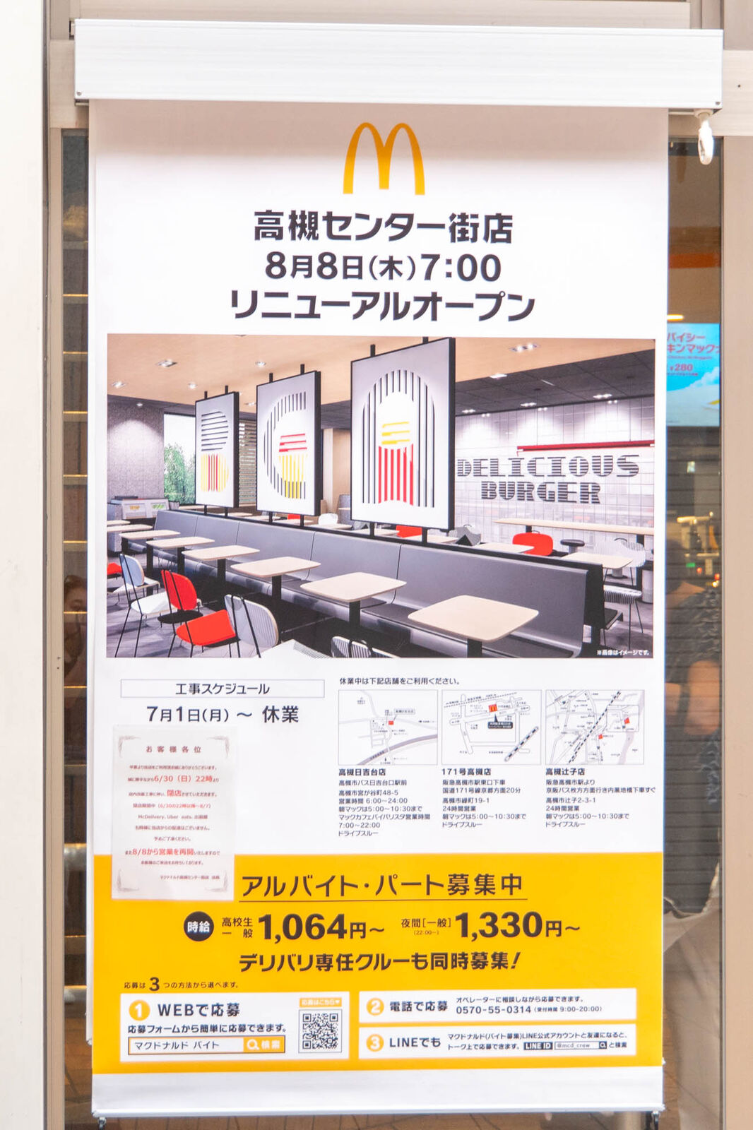 お知らせによると、「マクドナルド 高槻センター街店」はリニューアルのため6月30日22時をもって一時休業し、8月8日にリニューアルオープン予定とのこと。