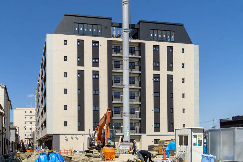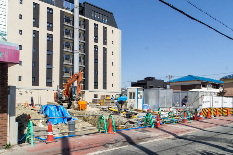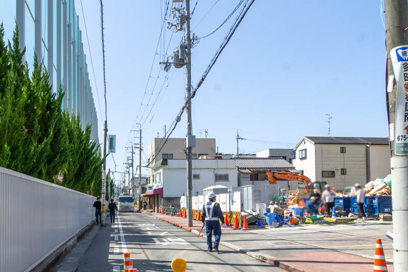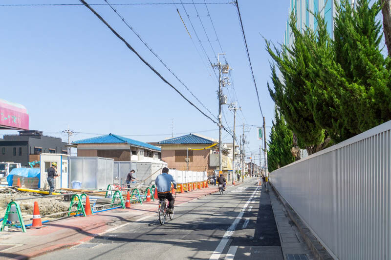 奥には4月に竣工予定の「レ・ジェイド 高槻南松原 Bright」が。