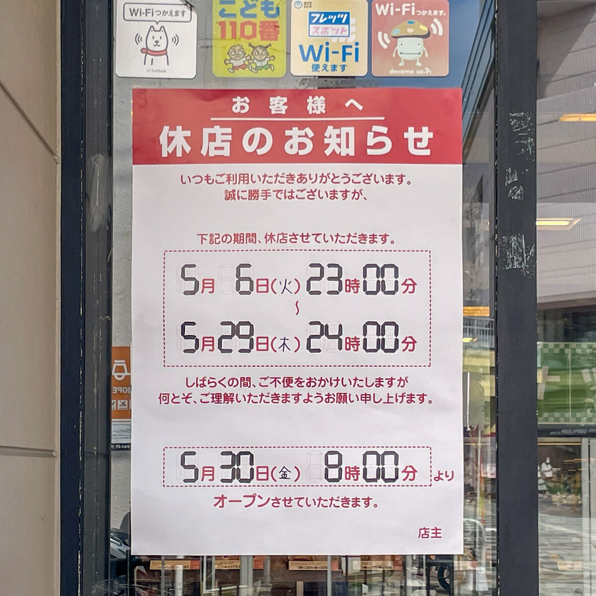 お知らせによると、5月6日23時〜5月29日24時まで改装のため一時休業し、5月30日8時にリニューアルオープン予定なんだとか。