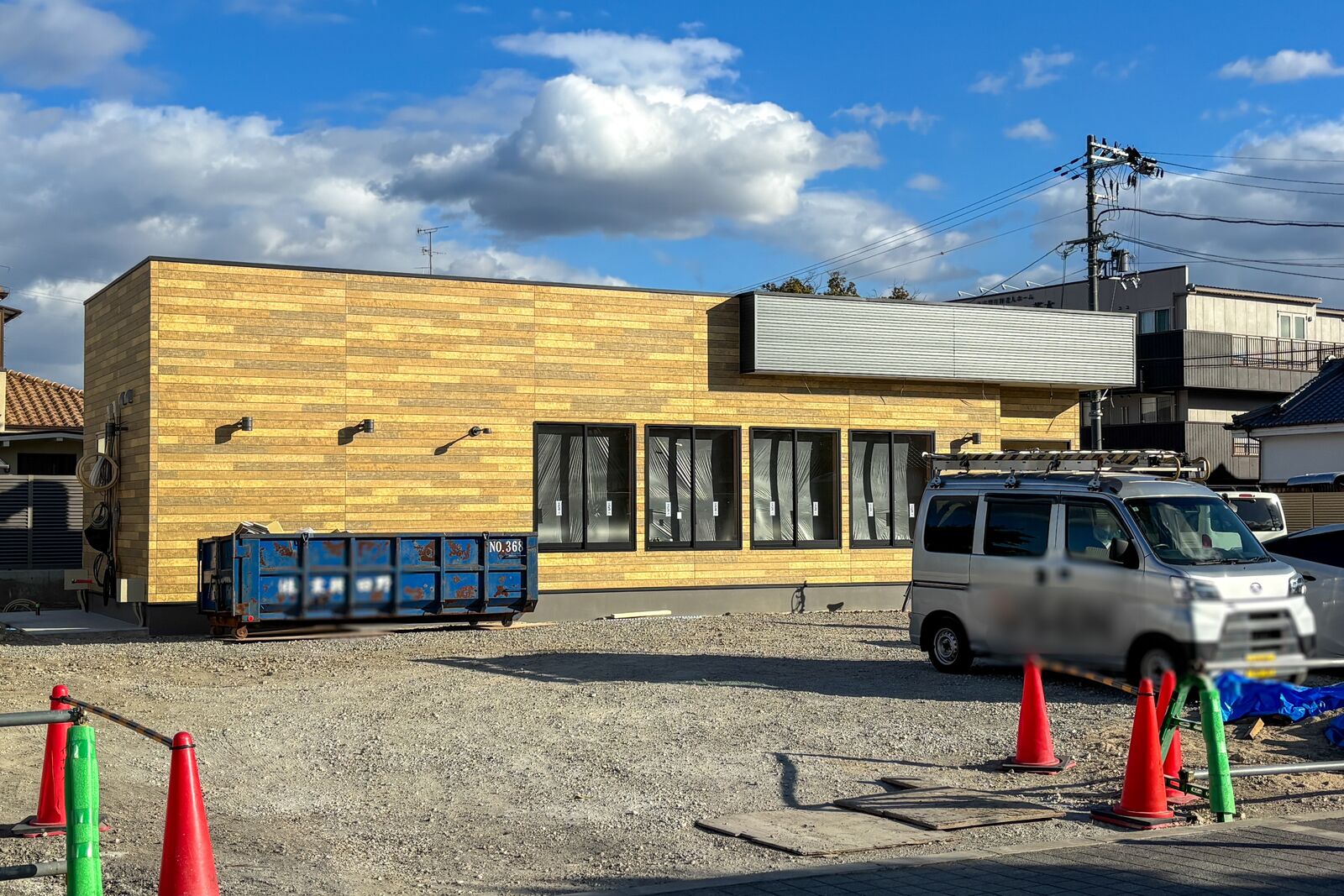 府道133号線ぞい鮎川につくってる「モスバーガー」の外観ができてきてる。3月下旬オープン予定