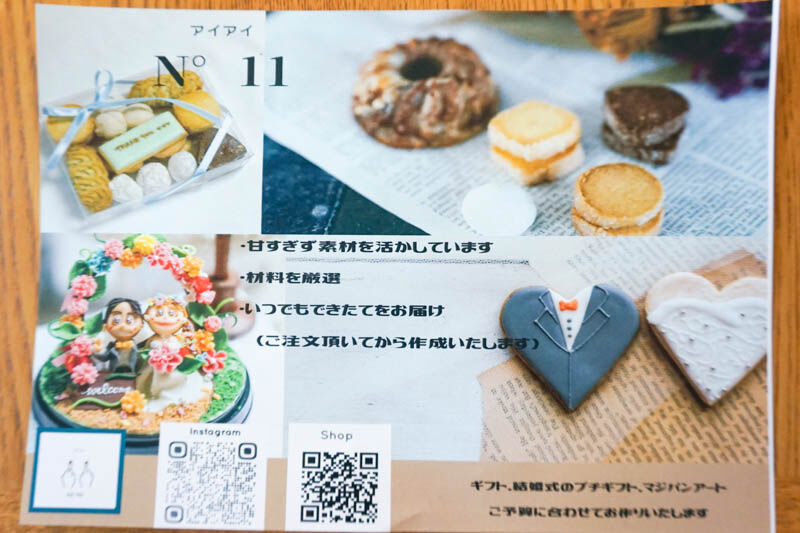 お惣菜なども販売されていて、上段には焼き菓子なども一緒に販売されていました。この焼き菓子というのは「N°11 aiai」の焼き菓子で「むすび(結)」の店内の一角で販売されており、ケーキなども予約注文できるそうです。
