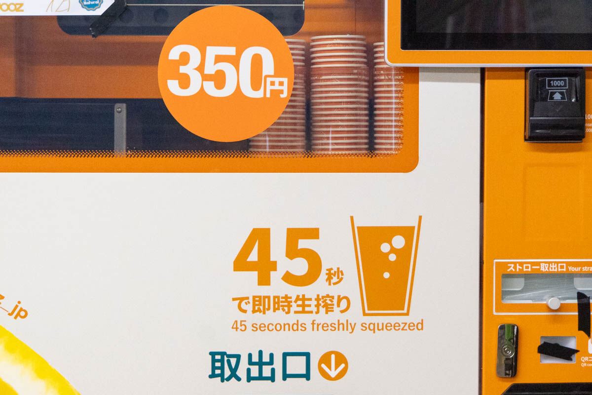 この自販機では、350円で即時生搾りのオレンジジュースが飲めるんだそう。