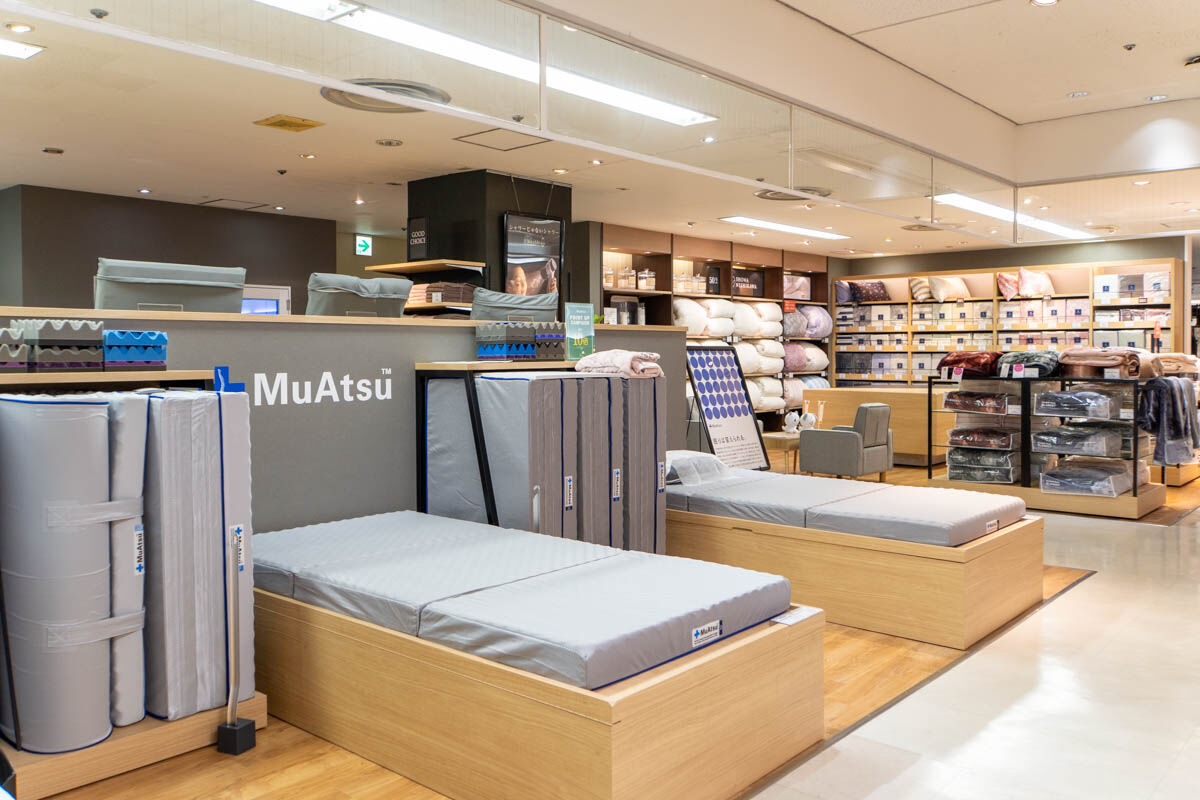 お店の正面にあるのが代表的なブランド「ムアツ」。「ムアツ」の歴史は、床ずれ防止の寝具として大学病院で採用されたことから始まったんだそう。