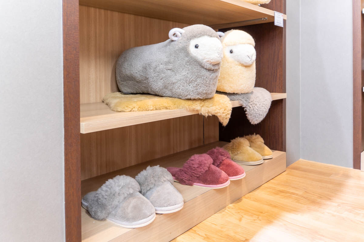 可愛らしい羊のぬいぐるみやスリッパ、敷物などがそろっており、ふわふわの触り心地でしたよ〜!