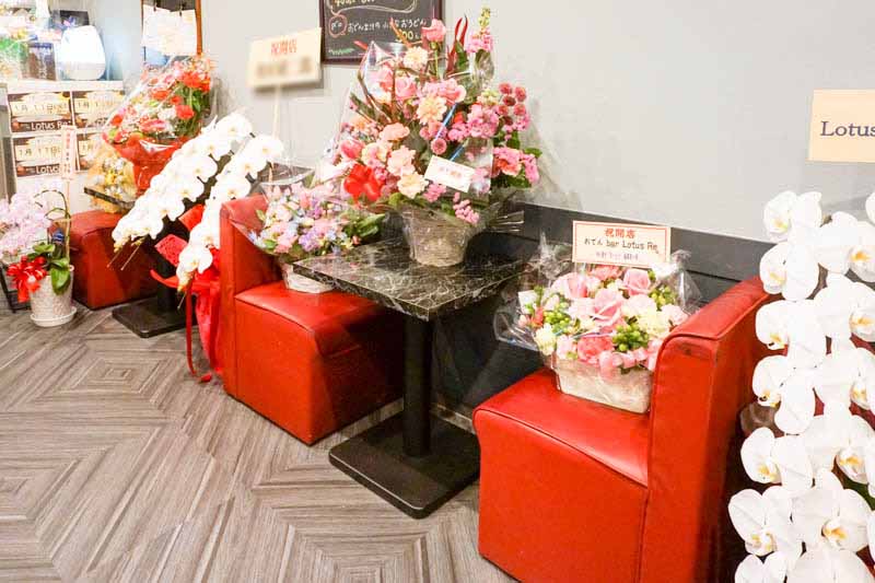 2名掛けの席もあります。外にもたくさんありましたが、店内にもたくさんのお祝いの花があり「今はお祝いのお花たちの席になっているんです〜。」とのこと。