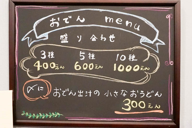 おでんは3種(400円)、5種(600円)、10種(1000円)と盛り合わせがあるようで、おでん出汁の小さなおうどん(300円)もあるみたいですね〜!