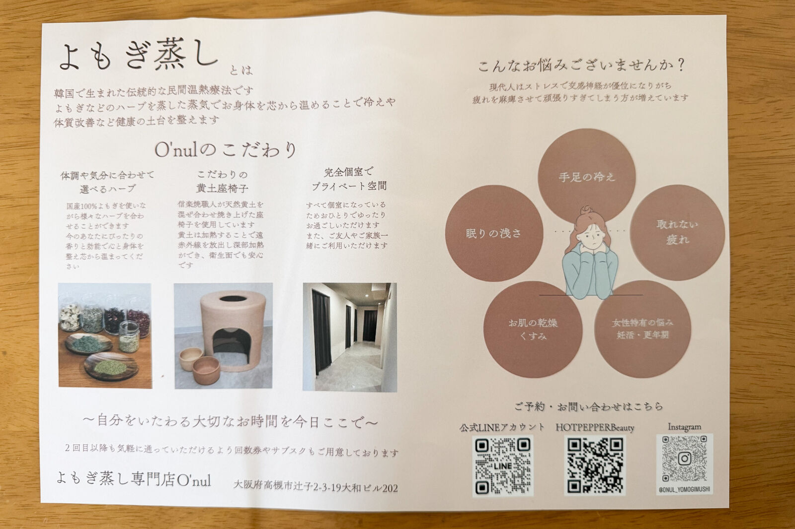 「O'nul(オヌル)」は信楽焼で造られたオリジナルの黄土座椅子と壺を使用した全室完全個室のよもぎ蒸し専門店で、2月21日にオープン。