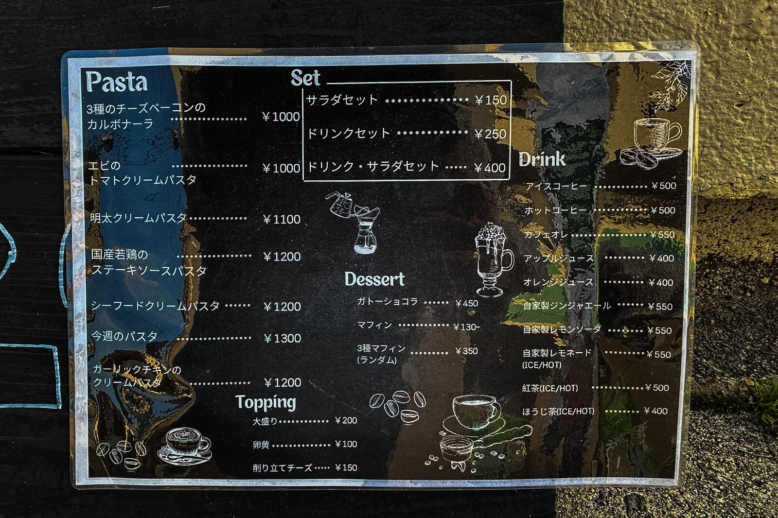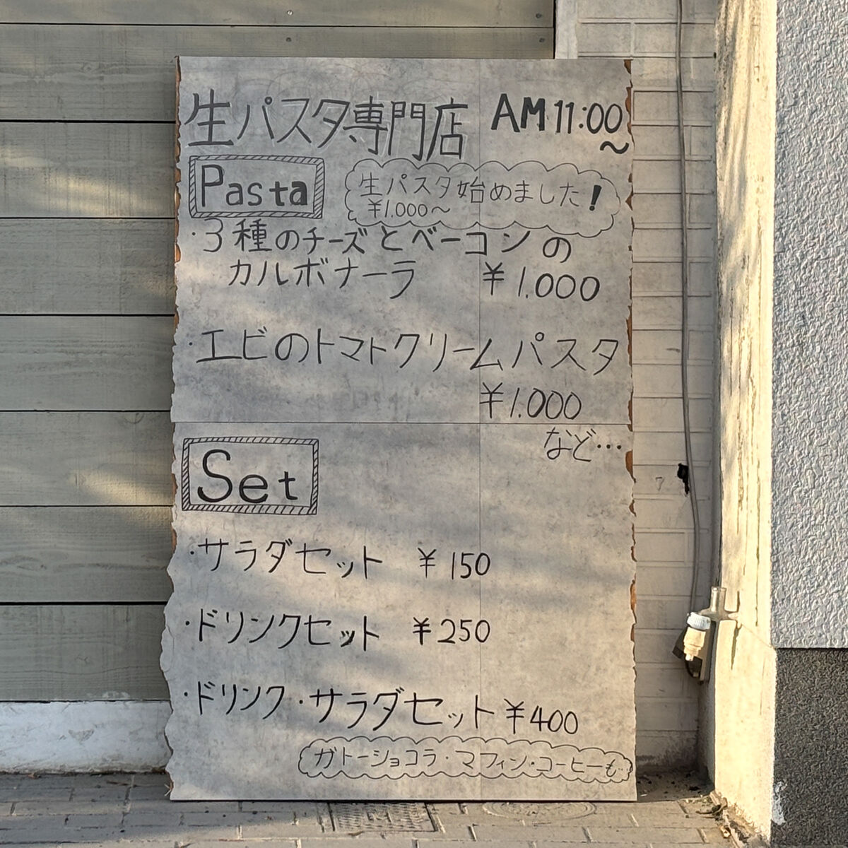 以前あった「おやつやいすのクレープやさん」が現在は「おやつやいすのパスタやさん」に変わっているようでした。看板も変わっていて、生パスタ専門店になっています。