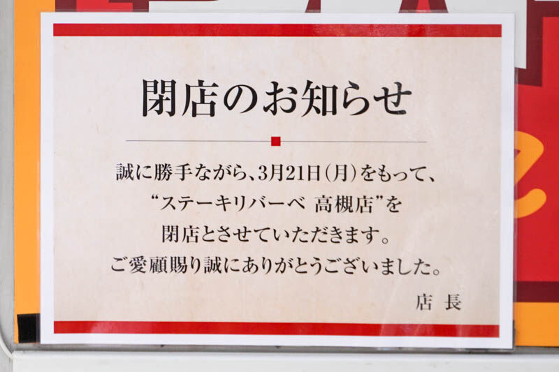 阪急高槻市駅ちかくの「ステーキリバーベ」が閉店してる