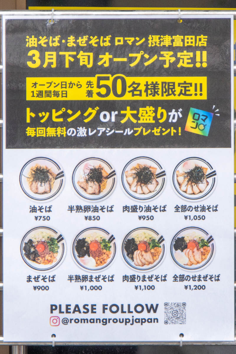 JR摂津富田駅近くに「油そば・まぜそば ロマン 摂津富田店」ができるようです。