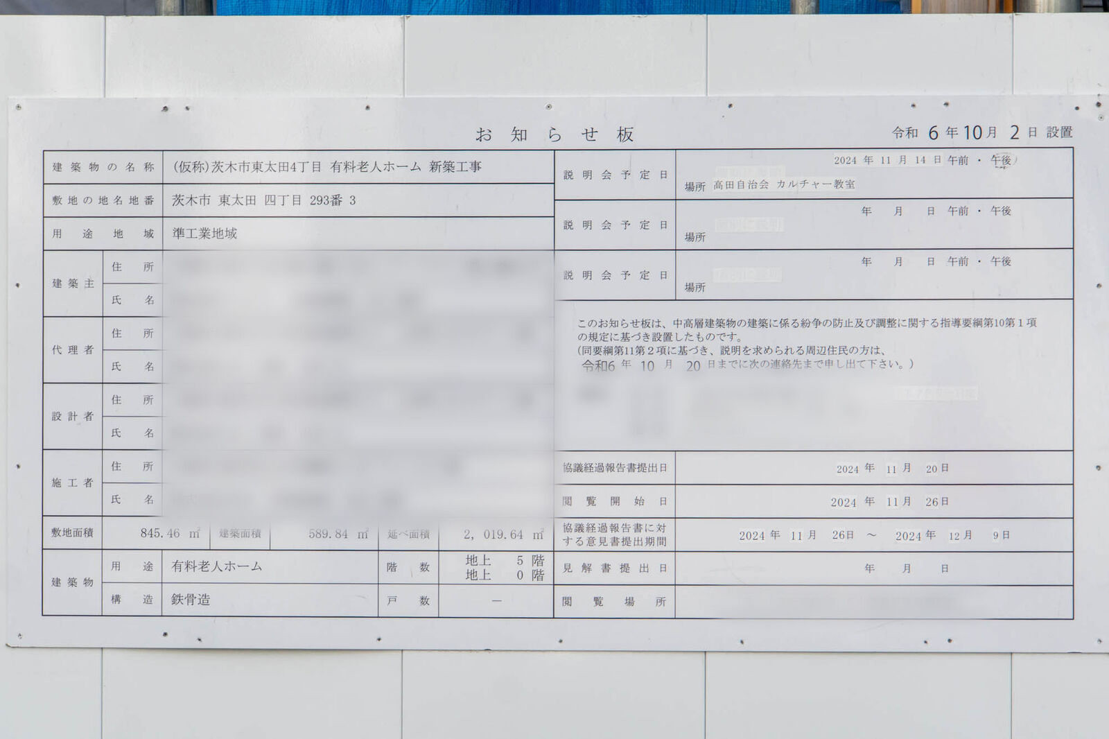 工事の看板によると、5階建ての有料老人ホームができる予定とのこと。