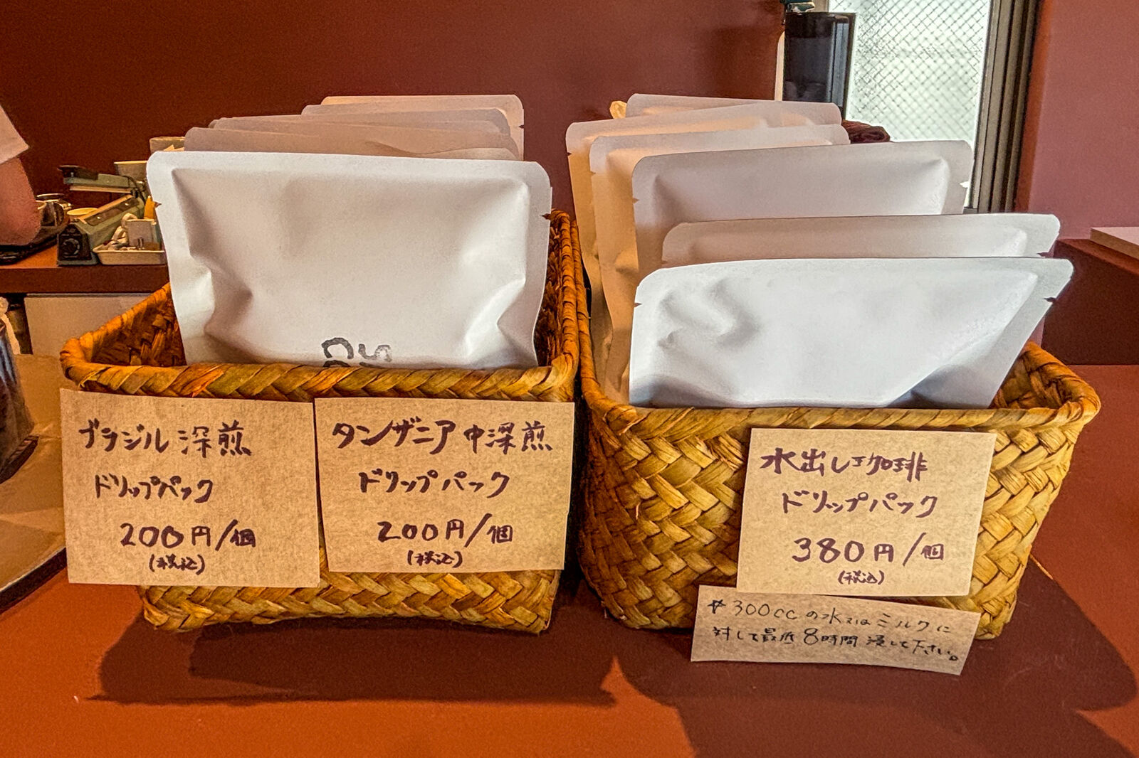 お店のコーヒーは焙煎機による自家焙煎の深煎り珈琲豆を、ネルドリップ(起毛した布のフィルターでコーヒーを抽出する方法)でじっくりと抽出しているようです。
