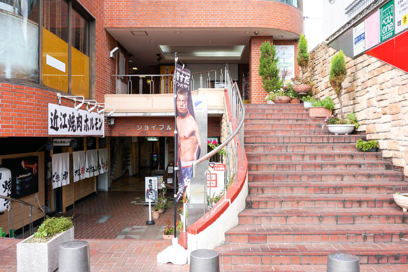 ジョイフルとんだの建物内。半地下1階にある「焼肉ホルモンすだく」と同じビルです。