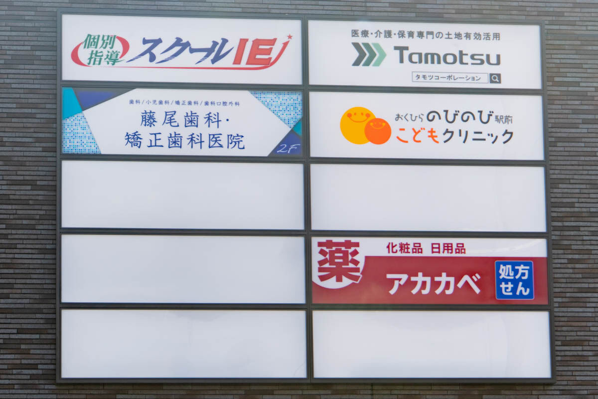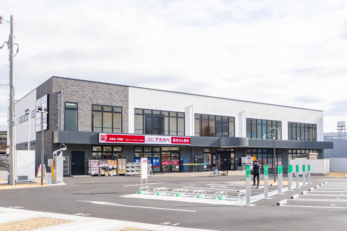 1月25日にドラッグストア「アカカベ」がオープンしていましたが、2月1日にはドラッグストアに併設して「アカカベ薬局」、1階に「おくひらのびのび駅前こどもクリニック」、2階に「スクールIE」がオープン!