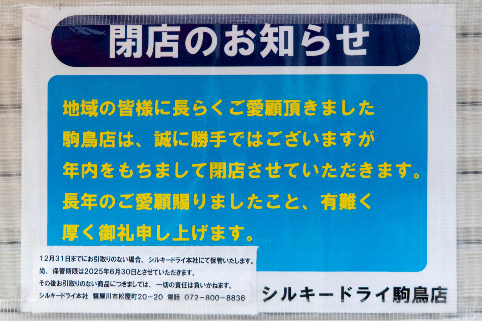 お知らせによると、「シルキードライ 駒鳥店」は2024年内をもって閉店したとのこと。