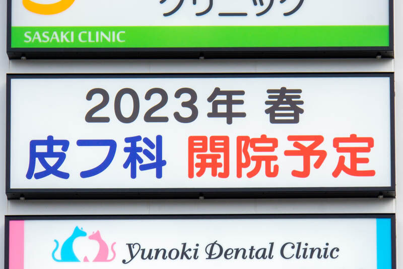 既存の看板に、新たに皮フ科が2023年春開院予定であると追加されていました。