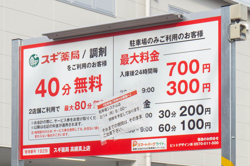 駐車場は、スギ薬局を利用した方のみ40分無料。2店舗利用で最大80分無料とのこと。