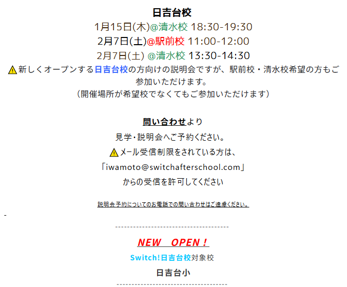 「Switch! After school 日吉台校」の対象校は日吉台小学校のようです。説明会が2月7日に行われるとのこと。