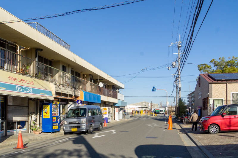 反対方向に行くと、くすの木公園テニスコートがあり、会社や工場が建ち並ぶエリアへ。
