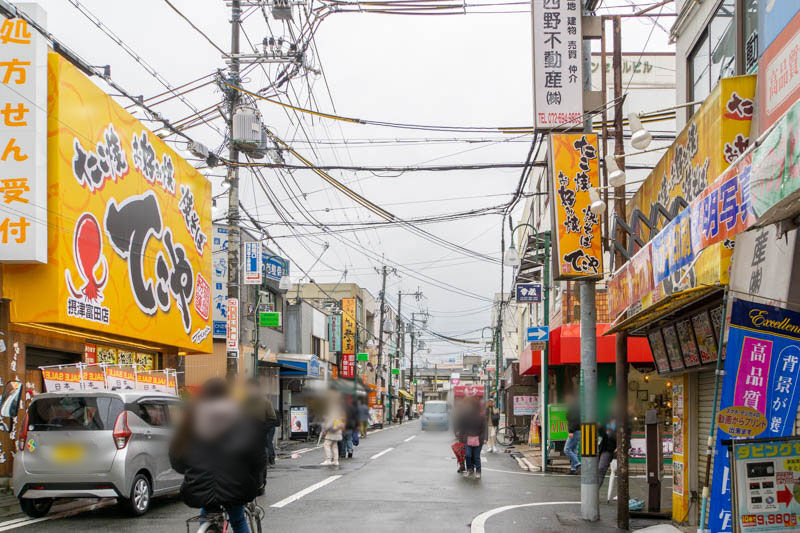 反対方向に行くと、阪急の踏切をこえて北大阪信用金庫やファミリーマートなどがあります。