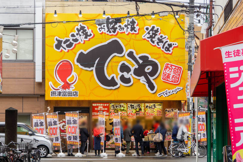 JR摂津富田駅ちかくにつくってたたこ焼き・お好み焼き・焼きそばのお店「てこや」がオープンしてる。行列できてた