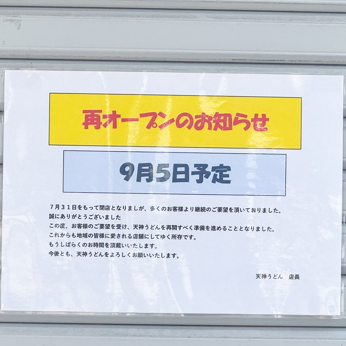 JR高槻駅前の「天神うどん」が再オープンするみたい。9月5日再オープン予定