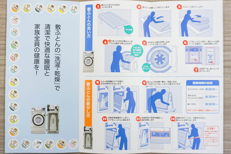 本店のときに聞いた説明では、大型のものは掛け布団、敷布団が洗えて乾燥まで出来るそうです。ただし、キルティング加工が裏までされているものでないとダメだったりなど気をつけないといけない点があるそうなので、事前に使い方等の確認を。