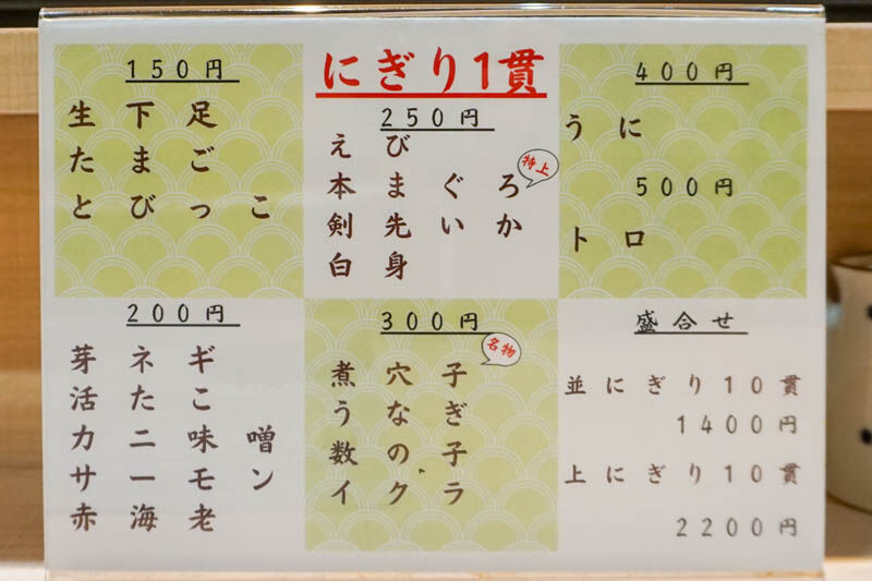 にぎり1貫150円からのようです。並、上にぎり盛り合わせもあります。