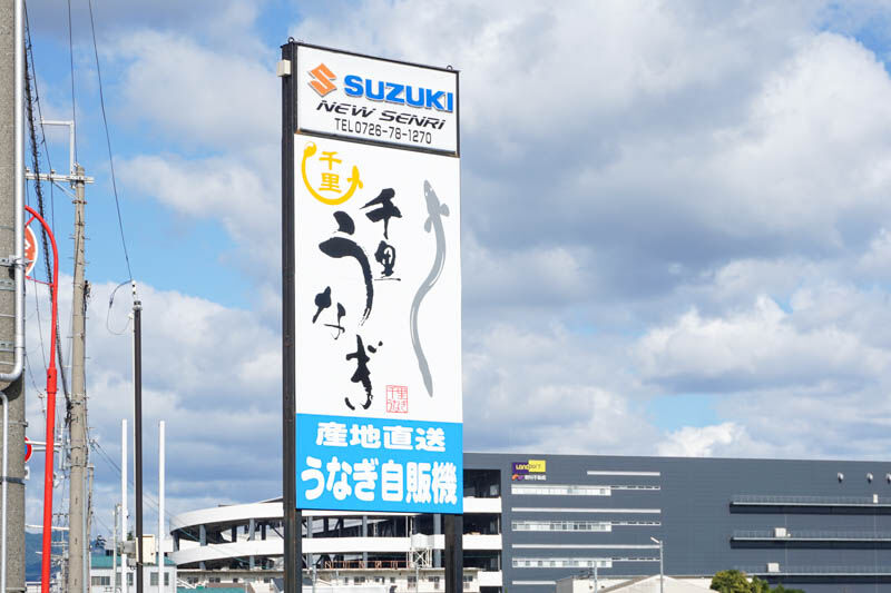 看板や自動販売機に表示されている「千里うなぎ」は、自動車整備・販売店のニュー千里が事業分割して設立した、千里養鰻という会社のうなぎみたいですが、老舗料理店などにも卸しているうなぎ。