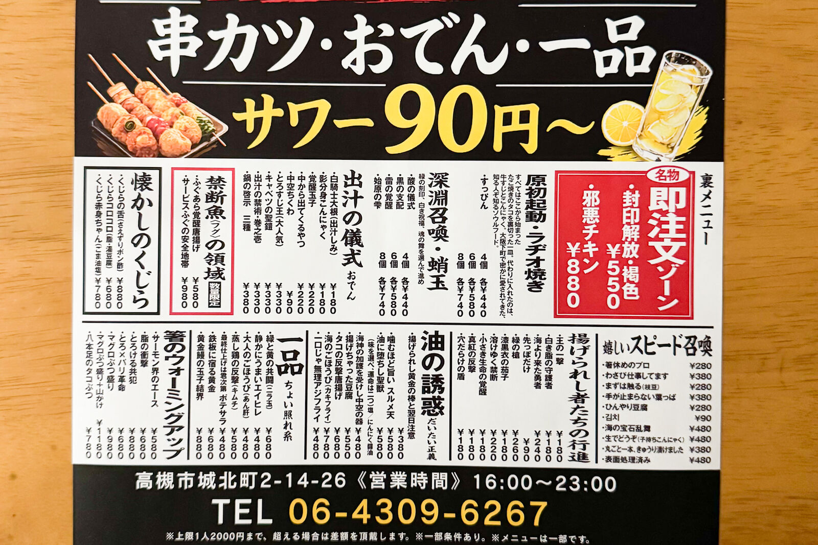 「高槻居酒屋 裏表商店」は4月1日にオープン。串カツやおでん、一品料理がいただける居酒屋で「ふざけた名前・真剣な味」がコンセプトだそう。